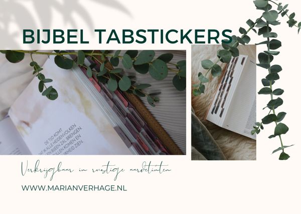 Bijbeltabstickers in het Nederlands in rustige aardetinten. Gedrukt op 2 velletjes A5 hoogwaardig mat stickerpapier.